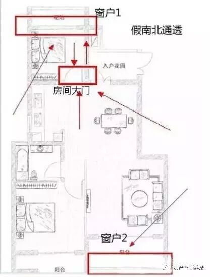 还有一个很典型的假南北通透的户型。虽然这乍看过去风可以从南北方向笔直地贯穿,但仔细琢磨可以发现,风必须经过两个房间的大门才能从其中一个阳台流出另一个阳台。也就是说想要让风贯穿南北就得把两个卧室的门都敞开着,这对于私密性很强的卧室来说是基本是不可能的一件事情。大多数人都不会愿意将私人房间敞开着门。所以这个南北通透着实令人推敲。再来看右边,一眼看过去正门对着窗户2可以通风,可是同样的道理,谁会将自己的居所大门敞开“对外开放”呢。从安全性和私密性都不可取。