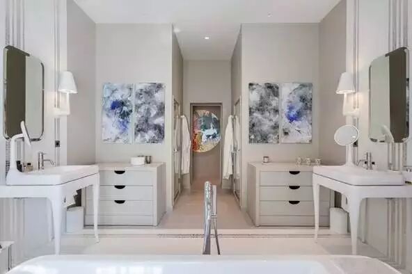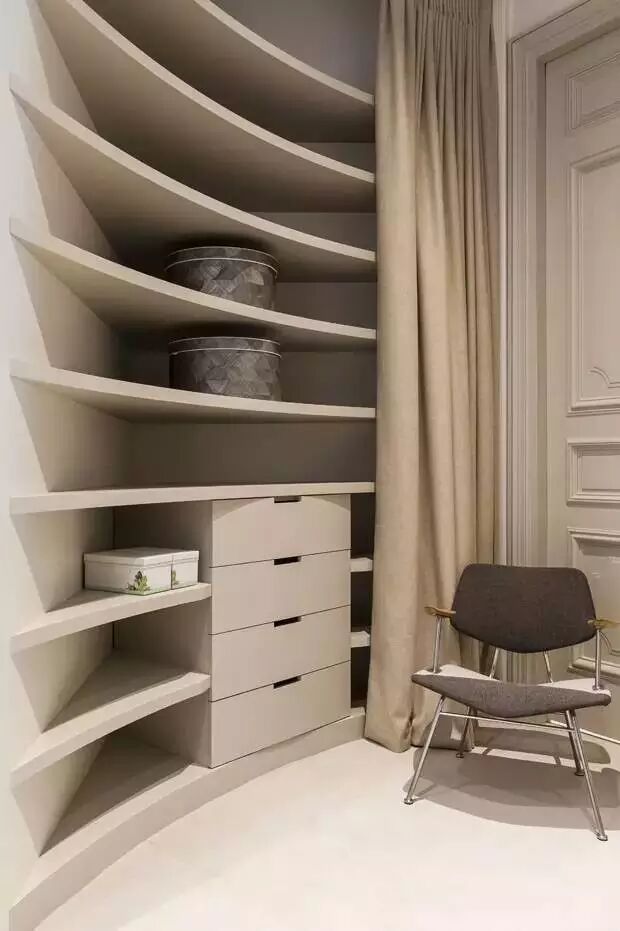 弧形的设计也是法式的代表之一,所以在设计中,能用到弧形的时候我也毫不吝啬,事实证明,在墙角用弧形设计格子柜更加节省空间,还能达到一定的设计效果。