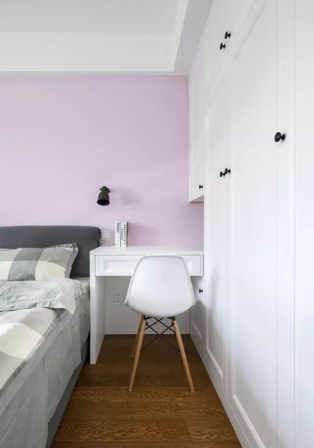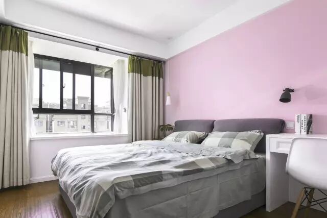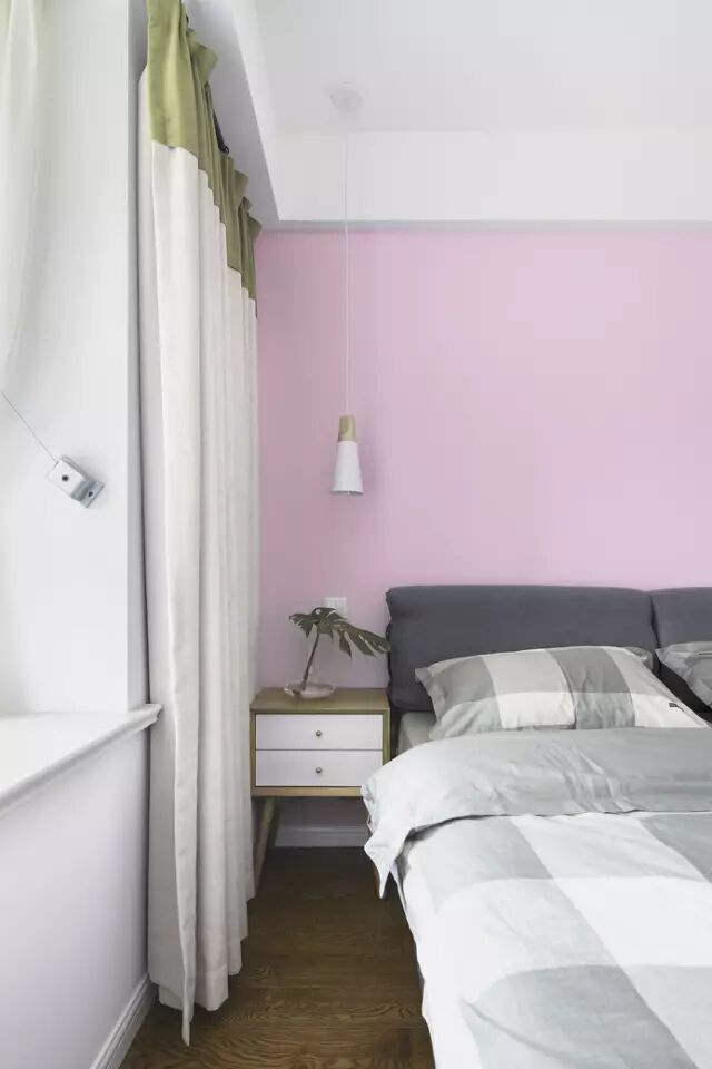 主卧粉色的墙体现了女主人的柔美,而点缀绿色,冲淡了太过女生的感觉,让空间达到平衡。