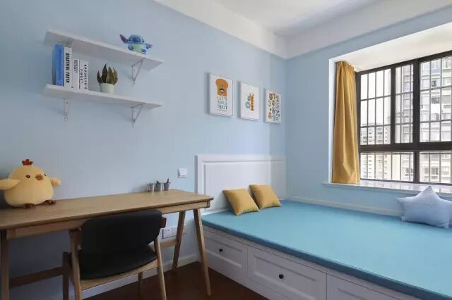 儿童房用了中性的蓝色黄色的对比色,榻榻米的设计也让这个空间变得更加灵活。