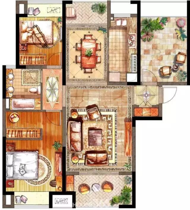 而像下面这种户型图,虽然非常貌美,看起来非常符合时下审美,所有家具的位置也都给你标注了,但是连尺寸都没有,其实作用并不大。