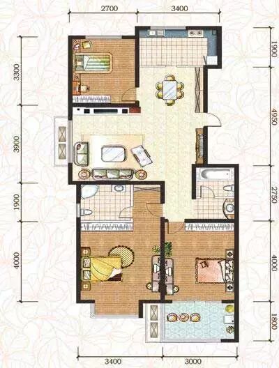 每个户型图上在墙的外围都会有尺寸的标准,通过这些尺寸,我们可以清楚测量各个功能区间的面积。都是mm为单位哦,比如2000就是2米。