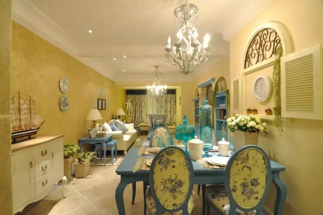 地中海风格居室的第特征就是手工制作、天然材质和曲线。由于地中海气候的影响,当地建筑多用拱门、拱窗。制作的时候可以在自家相应的地方贴上薄砖片,手工涂刷上黄色,并且故意留一些勾缝和粗糙的痕迹。