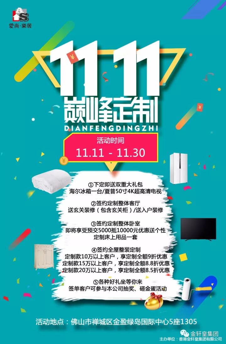 愛尚·樂居双十一提前狂欢,下定即送双重大礼包;全额定制打折大优惠;玄关/入户花园装修大放送;11月11日-11月30日乐乐在佛山市禅城区金盈绿岛国际中心5座1305等着你(小编偷偷的告诉大家~还可以在线参与哦),传统工艺实现不了的我们都能定制,全屋个性整装为你量“身”定制;专业的设计团队为你提供一对一服务;60天高效打造商品质量,自有工厂,一站式供货,品质有保障。