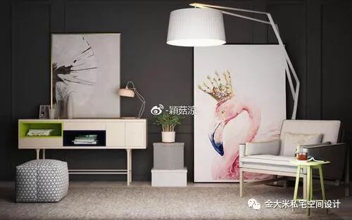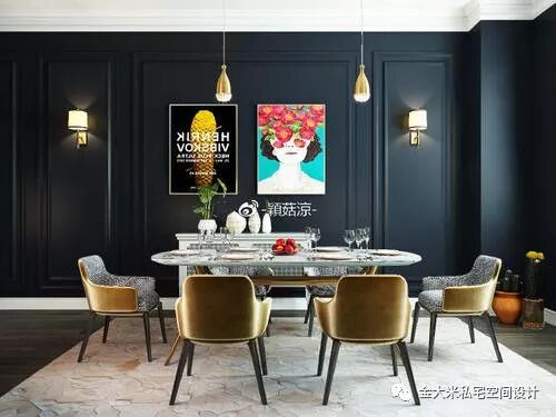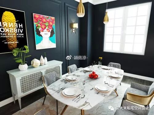上面这个案例就是墙面采用的是冷色系的墨绿色的墙体颜色,地面也是用的比较冷的地砖。所以买了家具有金色和灰色来进行调节。