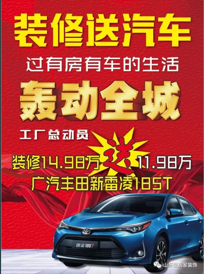 装修送汽车套餐一:100平方的房子装修仅仅需要11.98万,并赠送价值8.98万的丰田致享汽车一辆;