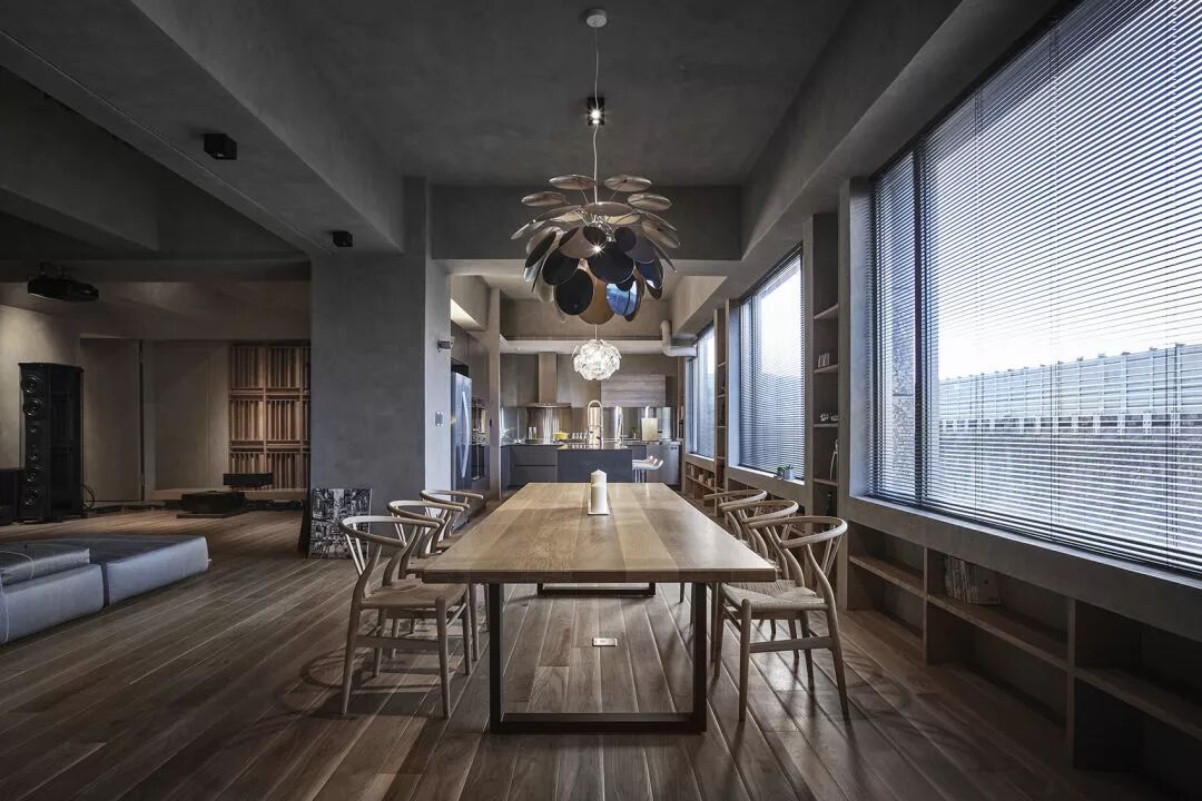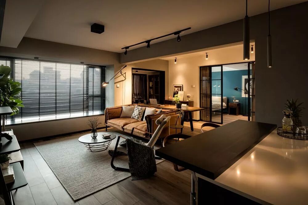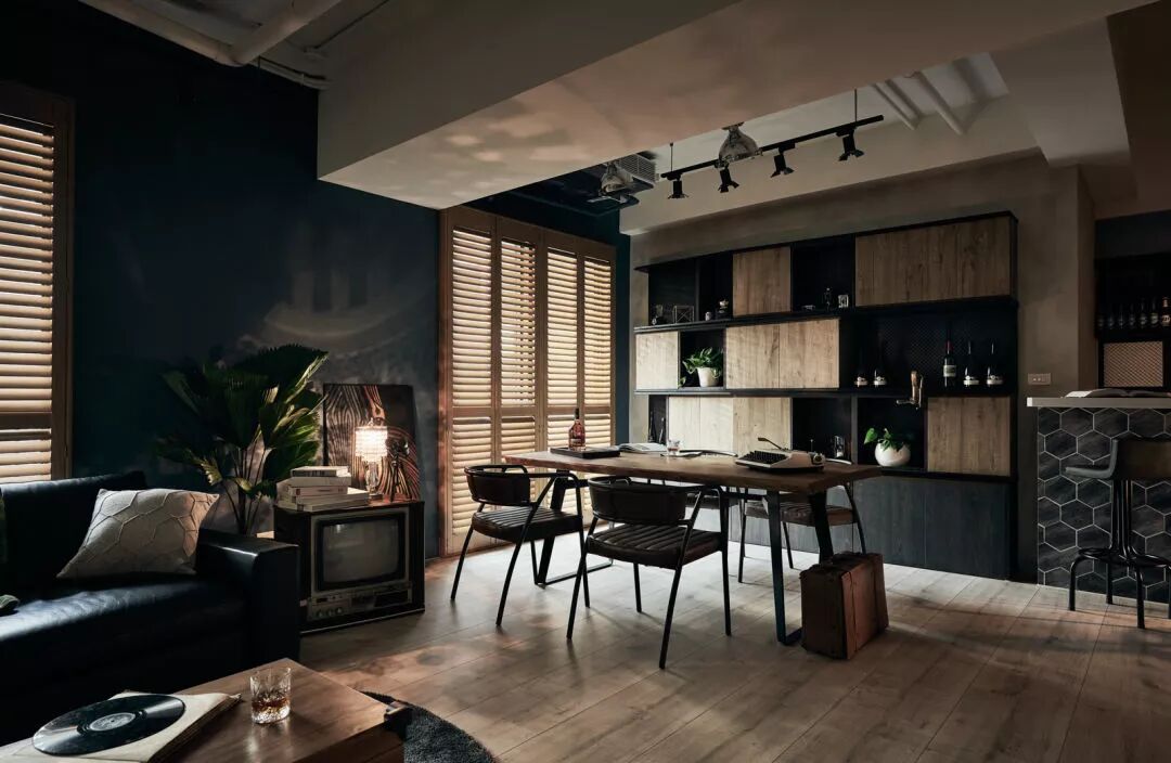 黑灰搭配为永恒百搭不过时的底色,再搭配一些木色、皮革色,完美显现出工业风低调风格下的复古、硬朗之态。
