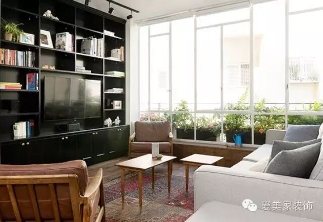 空间小电视背景墙如何装修?选择贴墙纸你就OUT了,若能用收纳柜代替背景墙不仅可以省去造型的费用,还能达到美观的效果,更能将图书、玩具、杂物收纳等各种功能。如上图所示,将客厅一面墙嵌入黑色烤漆收纳柜,代替电视背景墙,既不用占地方,还让客厅拥有强大收纳空间。客厅用长方形白色沙发布置,再配上方形彩色地毯,硬是将狭小空间布置成大气富含韵味的书香之家。