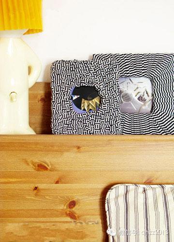 将废弃的T恤裁剪成宽窄一致的布条,将布条十字编织或缠绕在纸板上。布料最好选择双色或者带有花纹的,因为单色的布条制成的相框装饰效果不明显。
