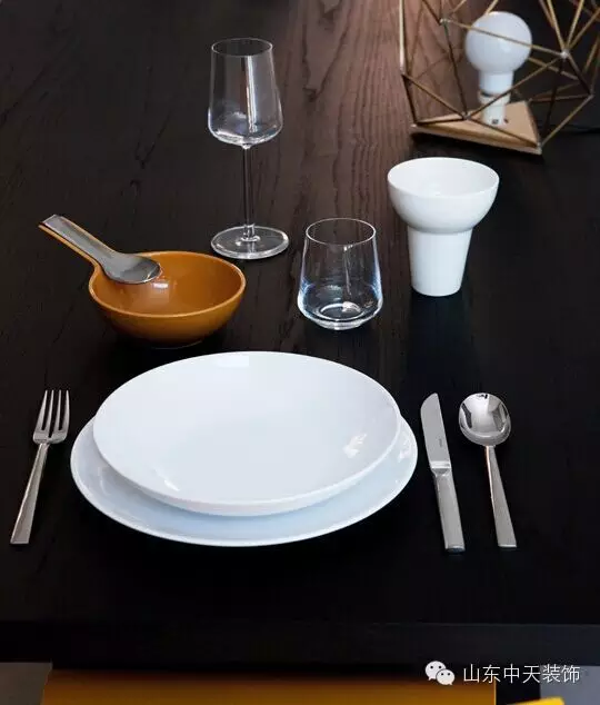 咖色餐桌,白色瓷餐具、玻璃杯,低调、内敛、时尚的餐桌布局就呈现出来了。