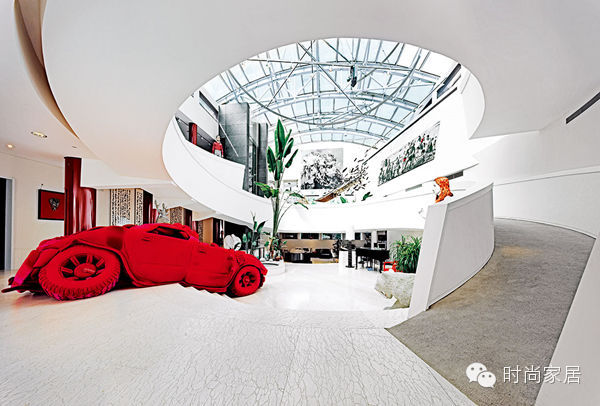 水池、汽车、树木、钢琴……艺术无声无息地融入大厅中央,人与自然被浓缩成艺术中的一景,因螺旋上升的空灵结构,显得熠熠生辉。