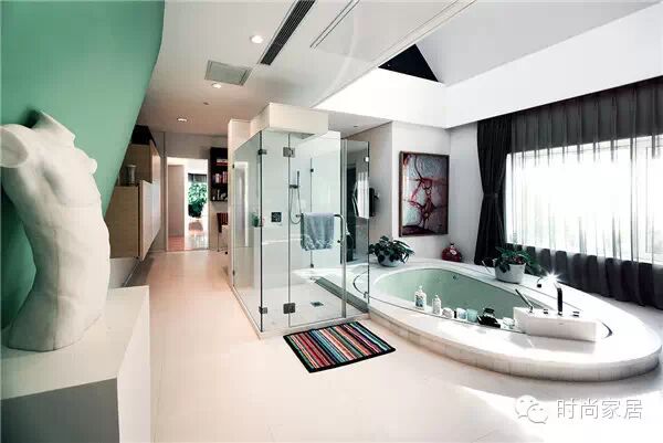 按摩浴缸居于主卫斜屋顶正下方,既能享受洒满阳光的按摩浴和淋浴,也能与一旁的石膏像和艺术画进行思想的交流。