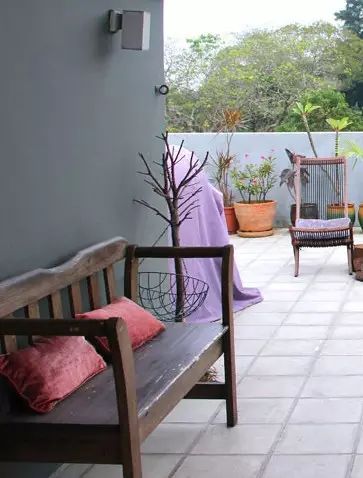 村里砍伐丢弃的旧木桩被Debi捡回来,重新刷漆,摆上盆栽,挨两张藤椅,变成家中的自然装饰。