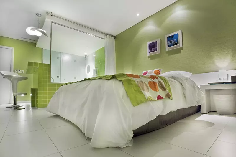 如果卫浴间因为没有自然采光而显得拥挤,不如大胆的采取开放式的设计,安装透明的玻璃,和房间内的其他区域合二为一。不仅个性时尚,视觉上更是通透,也合理的运用了空间。
