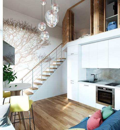 将一个房间分成了带有办公区域的卧室和带有餐厅的开放式厨房。