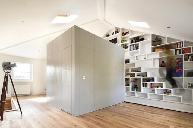 ►这款楼梯将正面墙壁全部设计成书墙,而阶梯的另一侧也稍微抬高来放置书籍,藏书量不可小觑,同时也省掉了书房的空间。