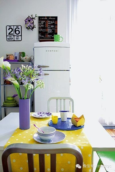 小黑板、马克杯、鸟屋、翻动的月历牌、简易餐具架营造出一个“时尚咖啡屋”。紫色花瓶的出现,还与苹果绿的餐厅形成色彩对比。