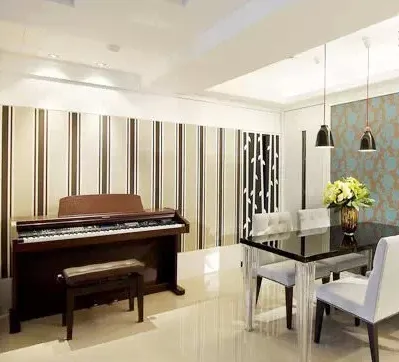 如果您的餐厅做了吊灯,不管是方形的还是圆形的,可考虑在吊灯处铺贴一圈壁纸,营造氛围。射灯打亮时,壁纸优美的图案会让吊顶显得十分漂亮。