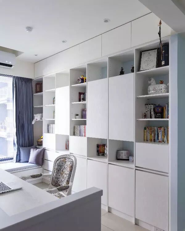 ▲ 书房背景同时也作为客厅背景是一整面的收纳柜墙,用大小交错的门板和开放隔层来丰富视觉层次