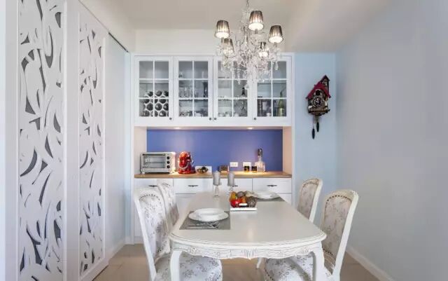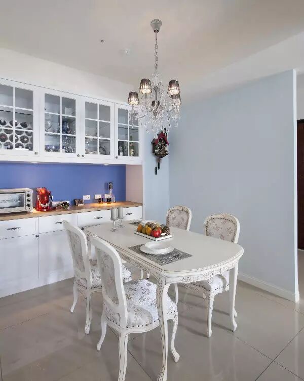 ▲ 水晶灯搭配雕花的白色实木餐桌椅,欧式奢华