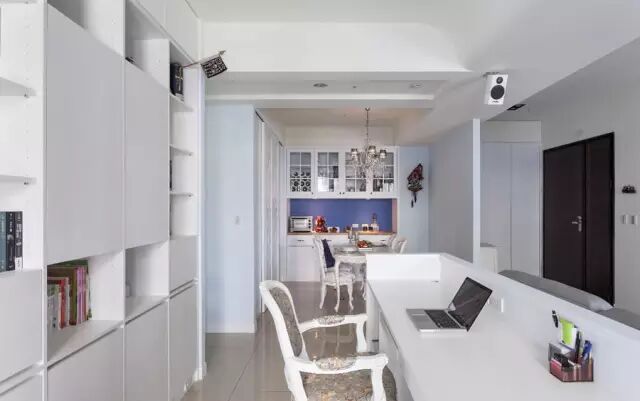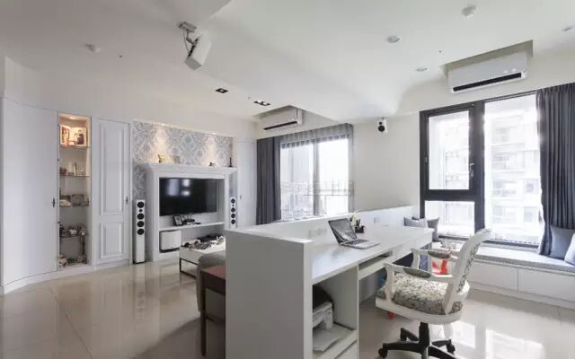 ▲ 客厅书房之间用书桌隔断,开放式的空间让视觉更开阔
