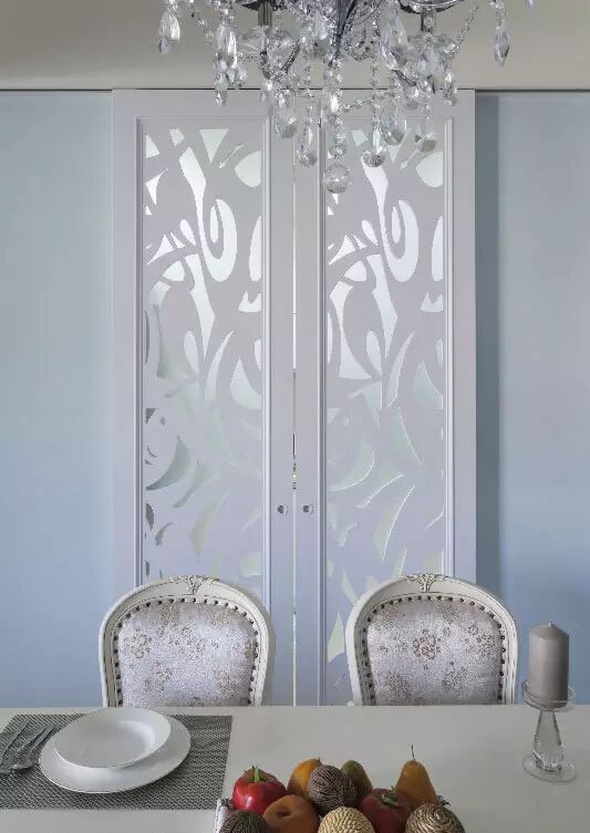 ▲ 餐厅和厨房的门板采用雕花密度板配磨砂玻璃,一改常用的玻璃移门,增添了优美气氛