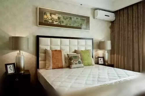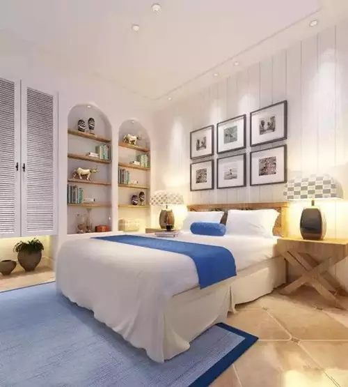 大床没有靠墙设置,而是空出一定的位置在床头两边摆放床头柜,对称摆放让空间布局更平衡,而且两边上落床也比较方便。