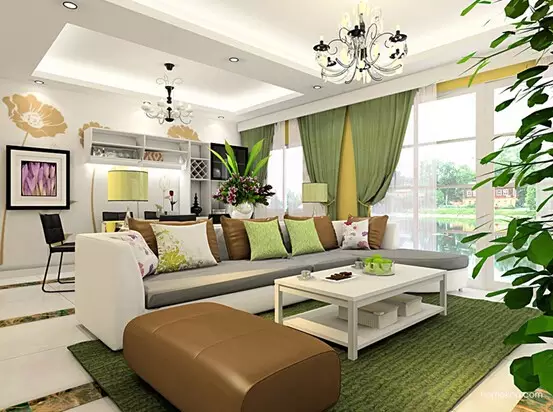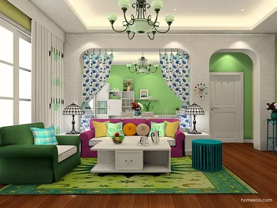 用了缤纷靓丽的色彩来表达春天生机勃勃的气息,拱形的墙体和窗帘分割客厅和餐厅,不仅美观而且更凸显春天的浪漫与温馨。