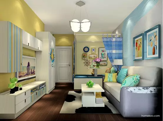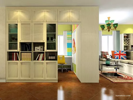 把客餐厅一分为二,分成客餐厅及儿童房,客厅与儿童房用趟门衣柜、书柜及电视柜到顶分隔开,客厅用矮柜作为沙发,增加了储藏的功能。