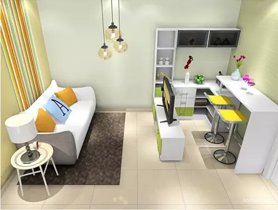 以中性色调来突出家具,电视柜将客厅和吧台完美地分割和拼搭起来,绝对是巧妙地区分出了不同区域。