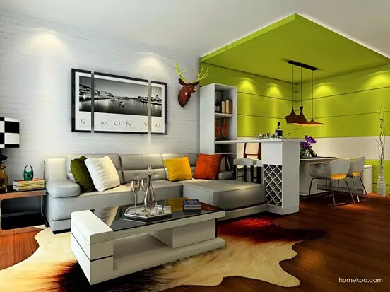 面板用亮白和葱绿朦胧搭配,简单的吧台将客厅和餐厅分割开来,让整体清新自然,别有一番风味。