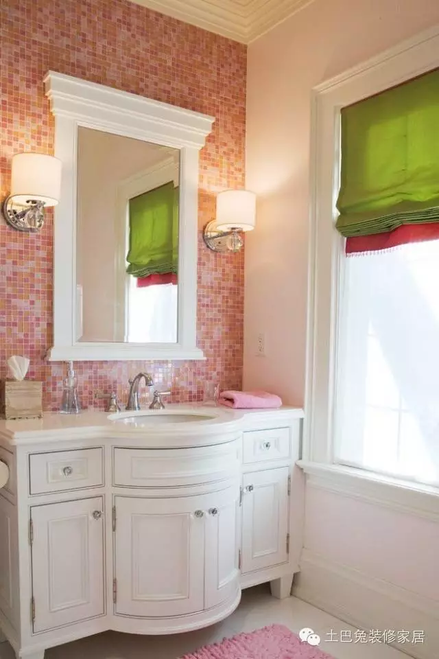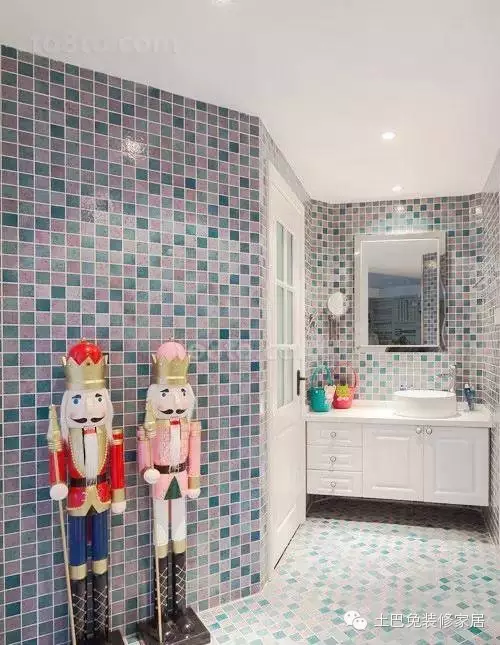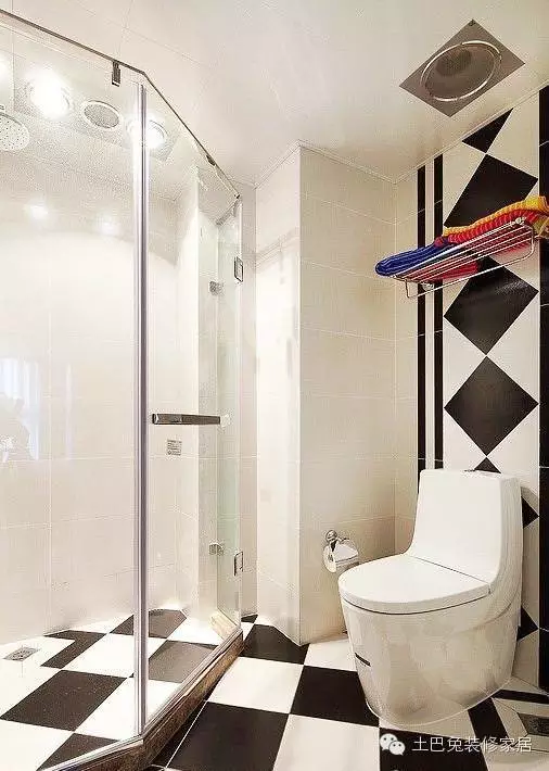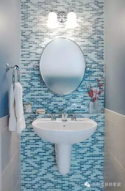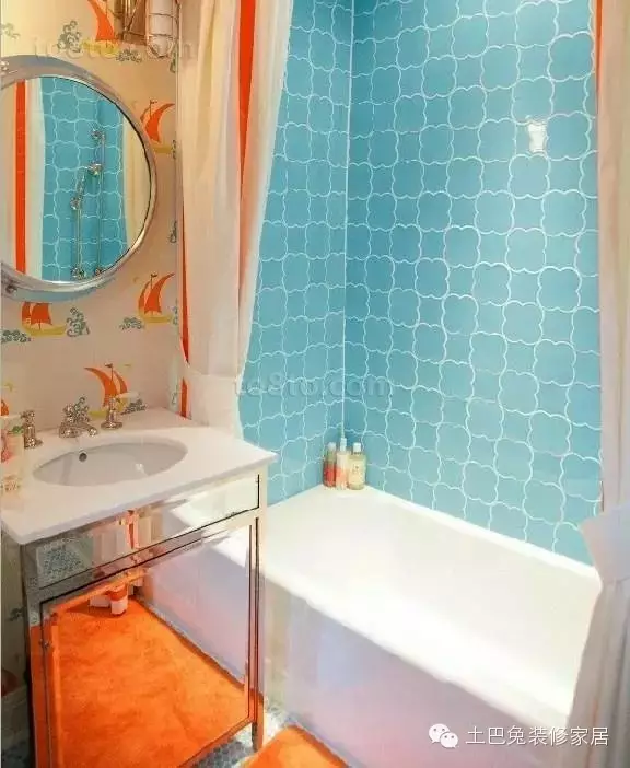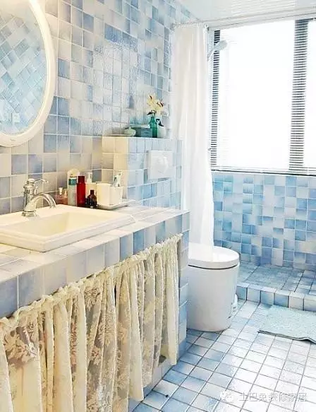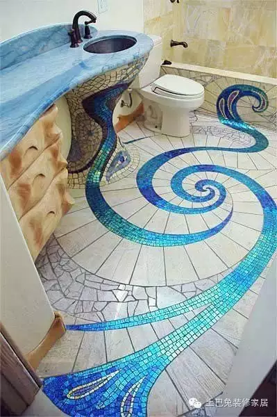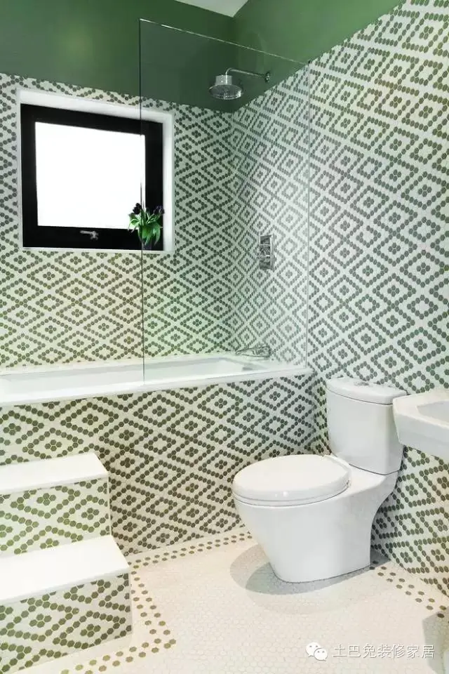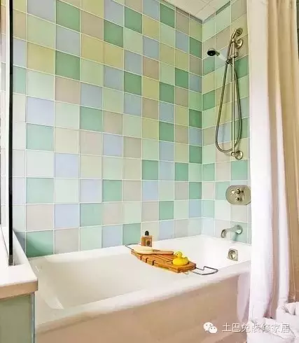 通过花式瓷砖搭配使用,在颜色上力求变化,让瓷砖创造出独具特色的浴室风格,另外,铺贴的方向和形状都可以大做文章哦~