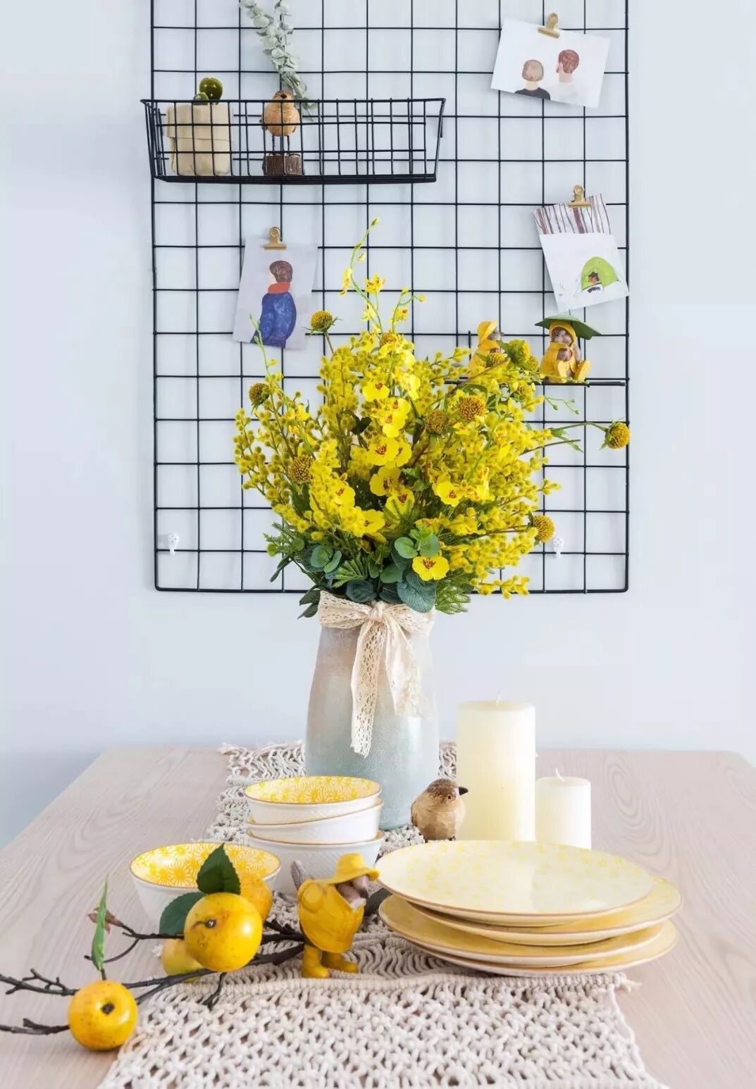 黄色鲜花与后方铁件墙饰打造清新就餐环境