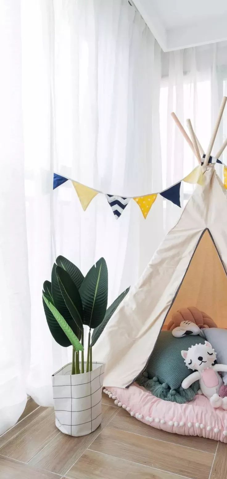 阳台木纹砖搭配白色纱帘放上印第安儿童帐篷营造温馨气氛