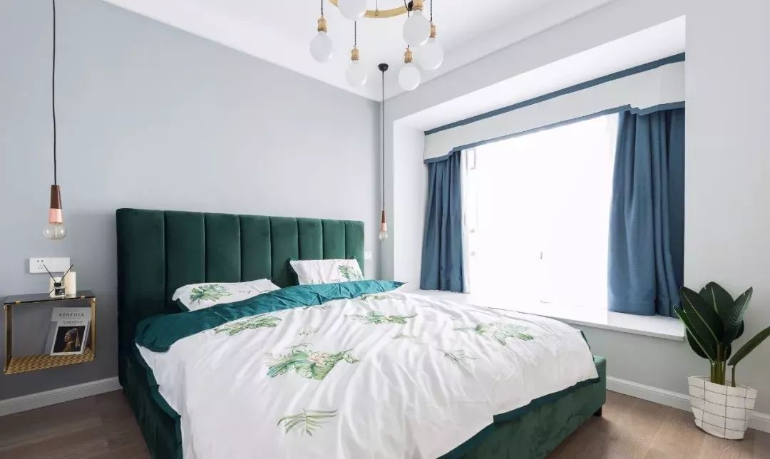主卧整体延续清新明快的空间感飘窗的米色与蓝色窗帘增加素雅视觉