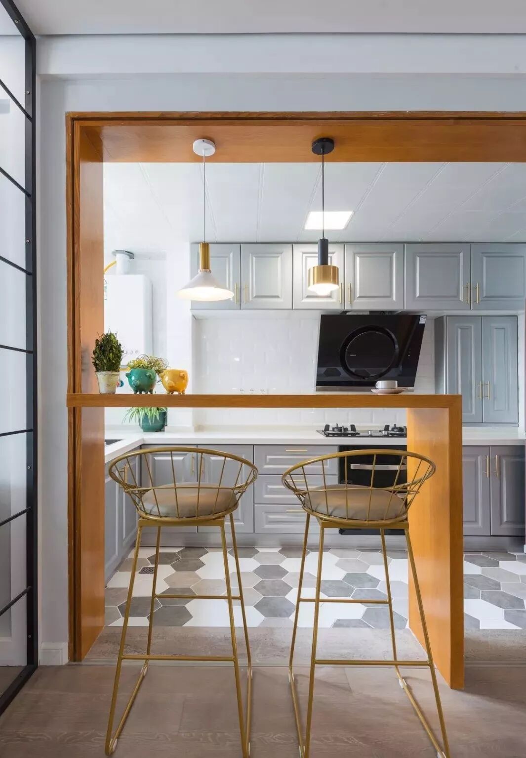 开放式厨房大地色六边形地砖搭配灰色柜门木色垭口延伸机能小吧台作隔断配合灯光的氛围烘托小情调满满