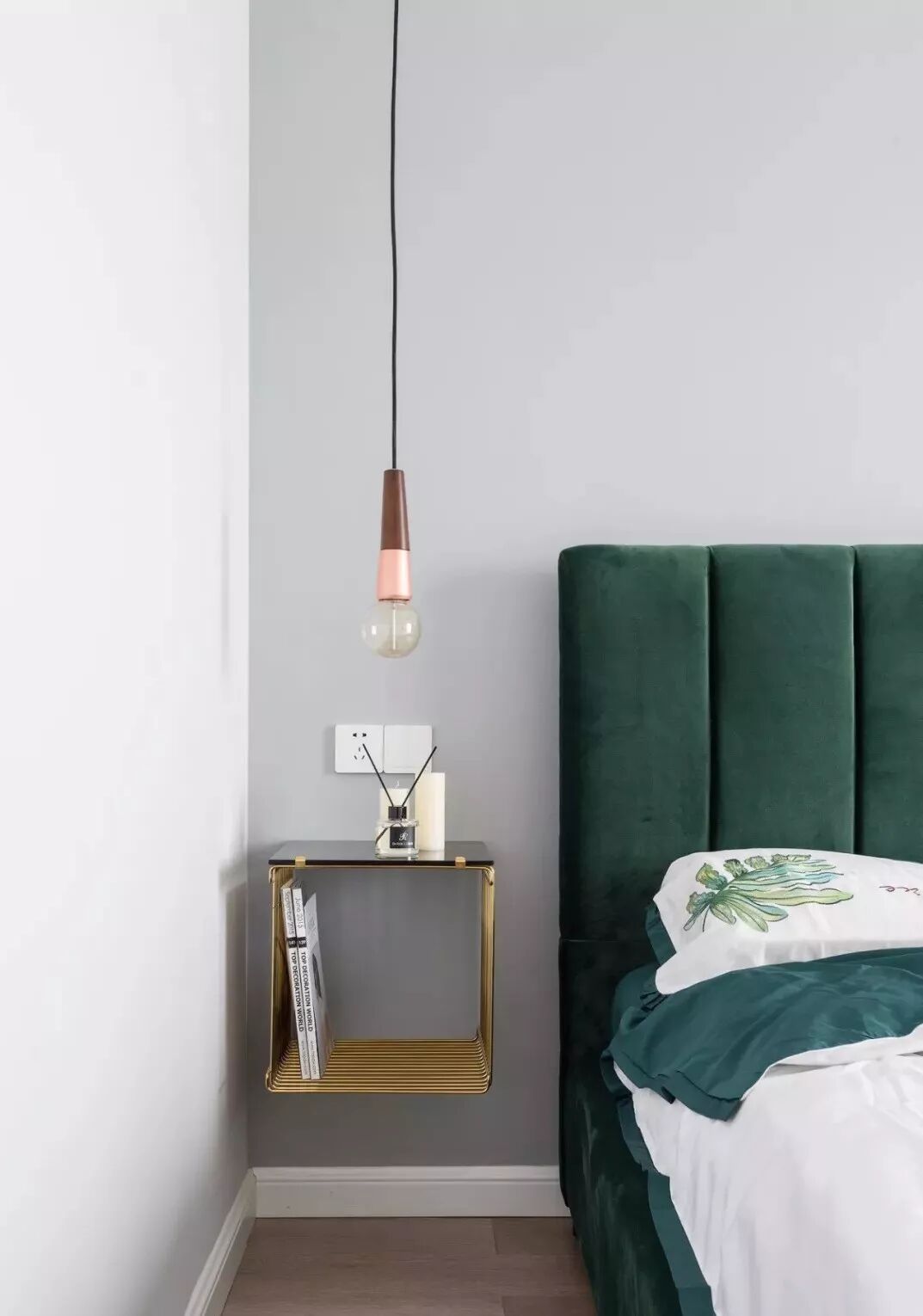 墨绿色大床搭配架空式床头柜金色元素提升质感