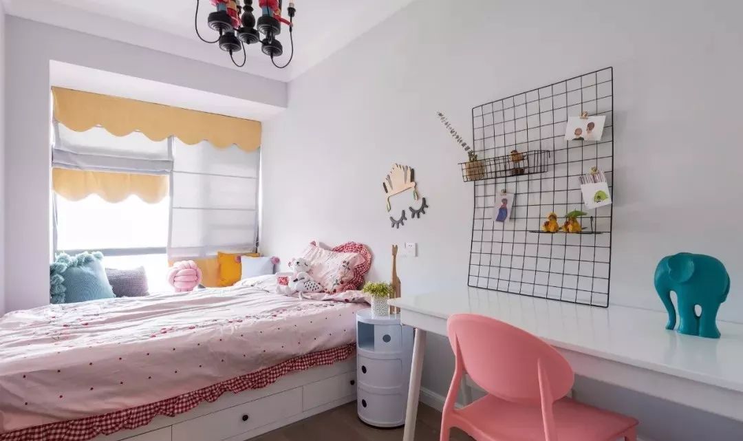 儿童房兼具书房功能浅灰色墙面搭配亮色调软装靠窗床铺也是收纳空间
