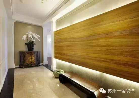 玄关走廊涉及大片横向延伸的黄金洞石,接近半宝石的瑰丽纹理,让人惊叹于大自然的造物之奇。