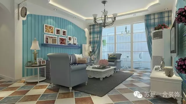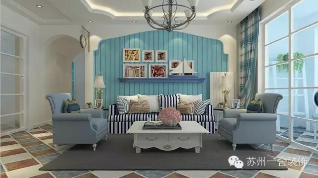 线条简洁流畅的条纹沙发突出了空间的现代感,颜色规律拼接的地面、靠枕、装饰画及蓝色条纹造型的背影墙渲染出宁静舒缓的空间氛围,让再烦躁的心灵都能沉寂下来,让人置身其中而忘了尘世喧嚣。
