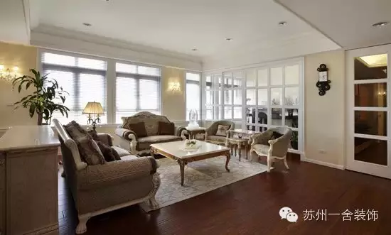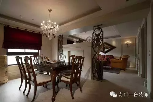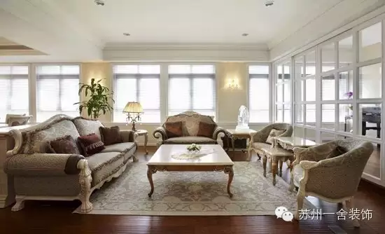 客厅至餐厅连续大面的开窗,让居室采光更充足,各种经典的美式古典元素串连全室。