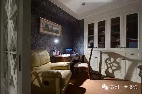 使用蓝色壁纸搭配深木头色的家具,沉稳中释放低调奢华感。