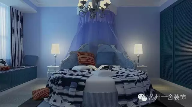 白色的吊顶和蓝色的墙体,白色梳妆台和蓝色衣柜,搭档蓝白相间床品,整个卧室形成鲜明的色彩对比,呈现出一个宁静、安详的卧室氛围。