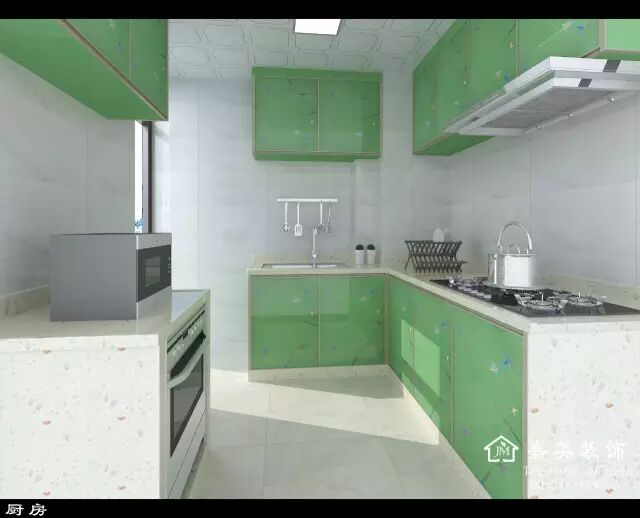 厨房厨柜采用了米黄色与草绿色搭配,整个空间让人感觉活泼亮丽 ,简洁而不沉闷。