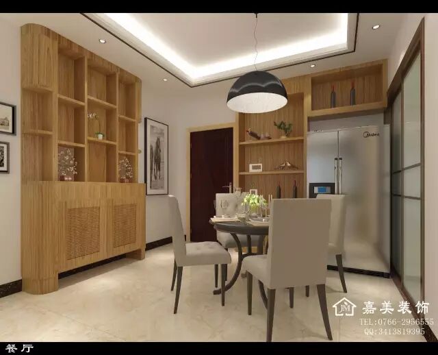 双门冰箱放置在餐厅,减少了厨房的拥挤与局促感,又方便了主人就餐时取用食品和饮料。