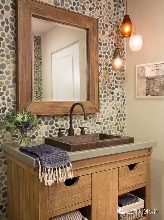 小编的话:把鹅卵石放在墙壁,抬头会触起溪水潺潺的美意,低调的吊顶在自然中加上一些人工的点缀,绿色植物带来春意凉爽。