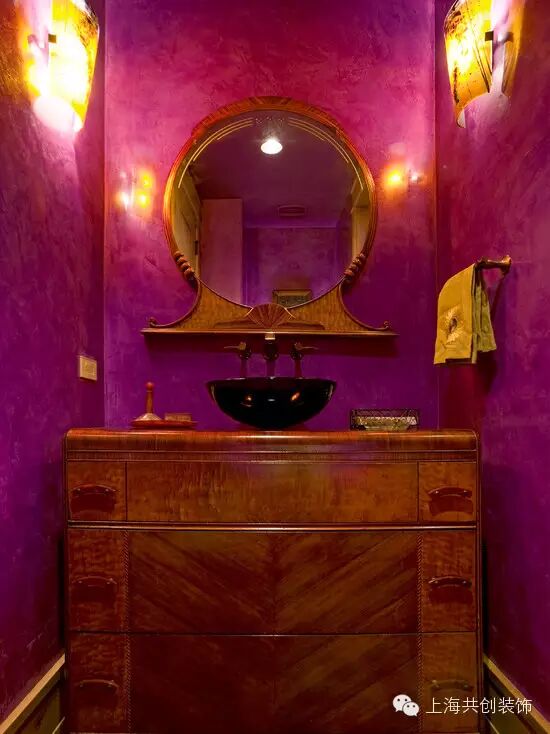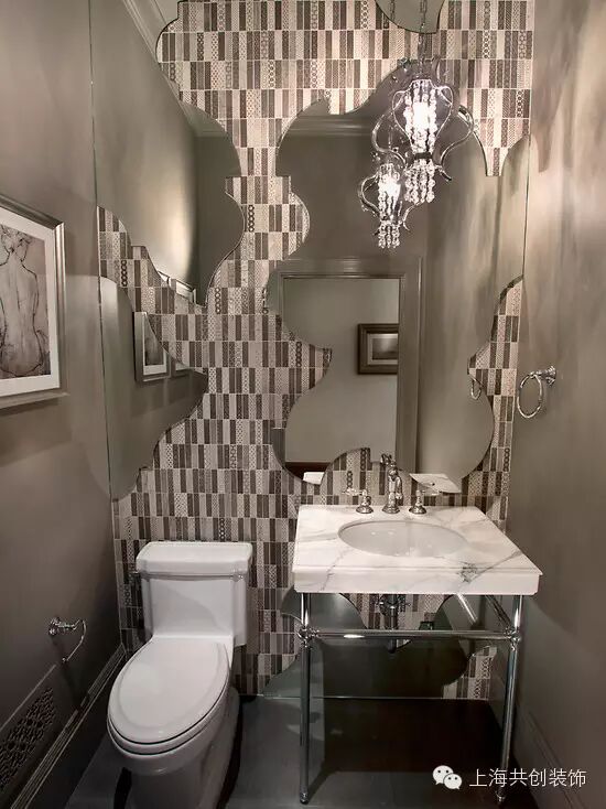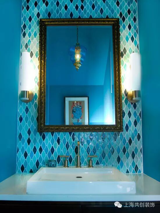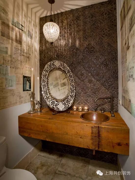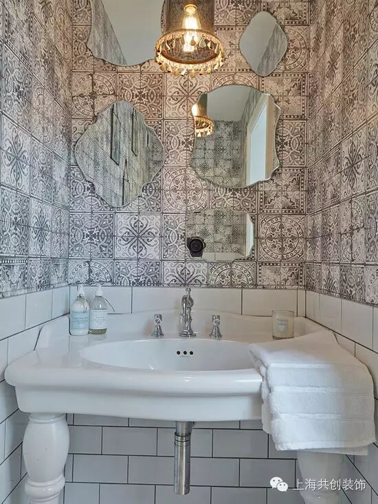 小编的话:复古花纹的瓷砖拼贴,本就给盥洗池别样风情,创意的使用不规则的镜面装饰,让空间错离在镜面的折射里,面积不大的空间里用一个小巧而精致的吊顶替换普通的灯具,更助于营造氛围。