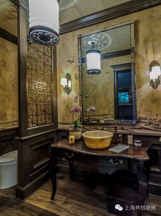 小编的话:复古的浮雕瓷砖斜拼,称为吊顶管线的画板。复古与华丽并存的镜子提升了盥洗室的高贵华丽感。