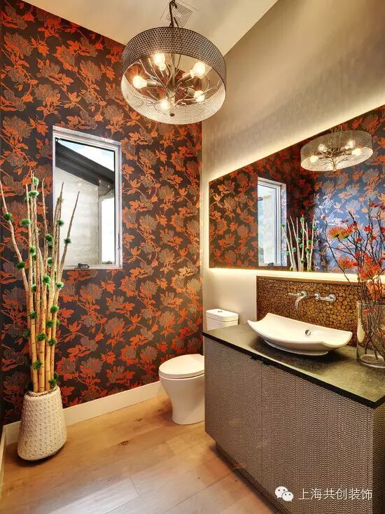 小编的话:盥洗室内墙壁以秋日枫叶的画面感呈现,给人秋之落叶的唯美和唏嘘。暖色系的色彩里打上星星点点的绿意,配合吊顶散发的灯光,让盥洗室也拥有浪漫情调。