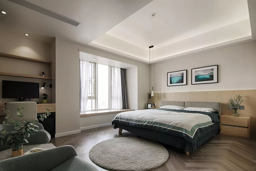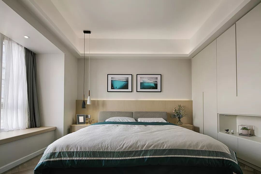 ▲卧室的床头背景墙墙角部分是木色护墙板,上部分的墙面挂上2幅装饰画,情调的飘窗,衣柜中间留空出一个作为临时置物的空格,非常的简洁实用。